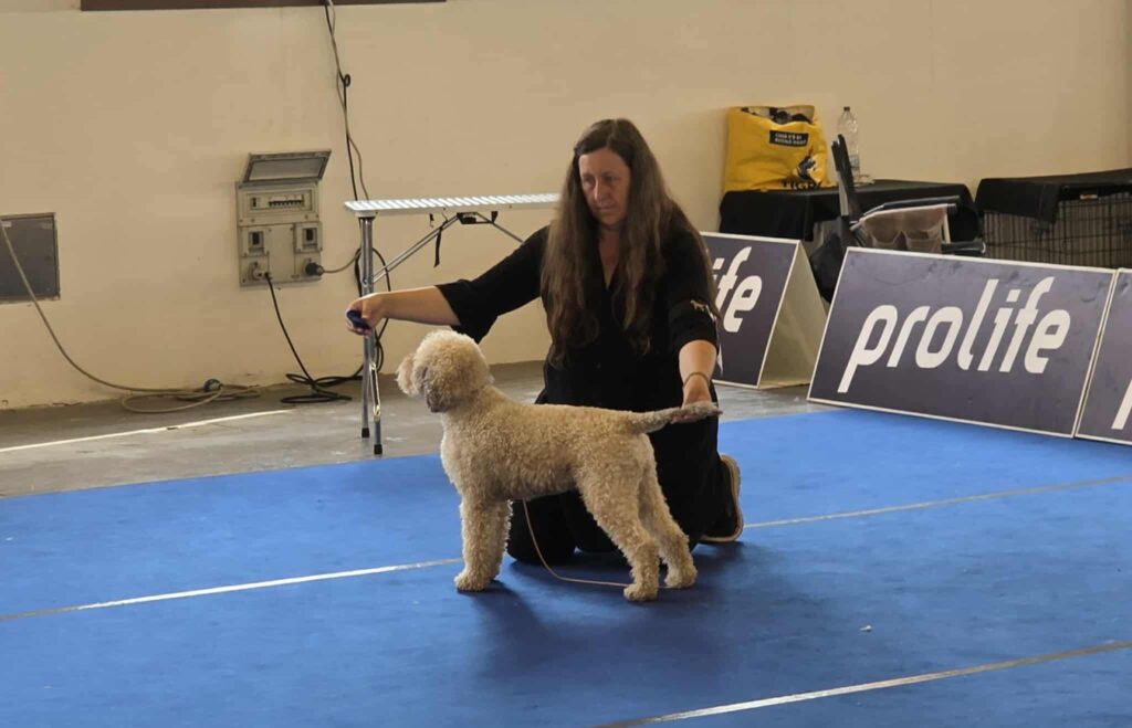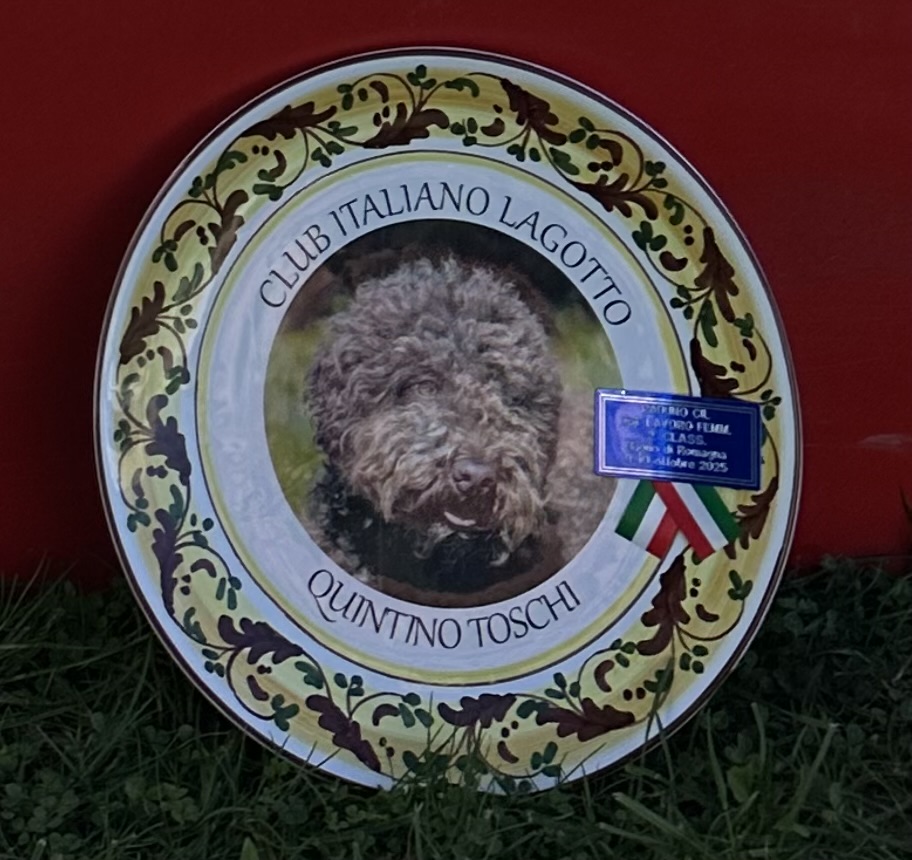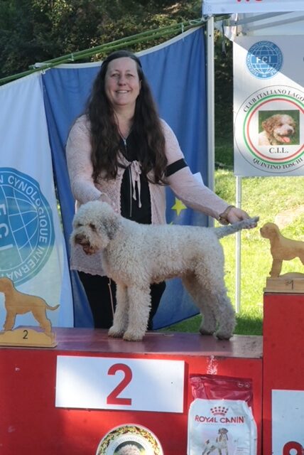 Abgeschlossen haben wir diesen Ausstellungsblock mit dem Besuch des grössten Lagottoanlasses der Welt – dem Raduno vom italienischen Lagottoclub C.I.L. in Bagno die Romagna. In diesem Jahr waren 227 Hunde für die Ausstellung gemeldet. Seit vielen Jahren fahre ich mit einer Schweizer Gruppe zu diesem Raduno. Katrien van Gemert hat die Hündinnen an diesen zwei Ausstellungstagen gerichtet. Auch sie ist eine absolute Rassekennerin und ich habe mir einen vorzüglichen Richterbericht von ihr erhofft und wieder hat Fiori alles übertroffen. Wir sind in der Arbeitsklasse gestartet – es waren 20 Hündinnen gemeldet und Fiori hat den zweiten Platz in dieser Klasse erhalten und einen Teller gewonnen. Ich kann es fast nicht glauben und bin sehr dankbar und glücklich. Danke vielmals Katrien für diese Anerkennung von Fiori. Da ich nicht sicher war, ob Fiori läufig wird und dann nicht an der Arbeitsprüfung starten kann, habe ich sie noch an einer nationalen und internationalen Show in Italien gemeldet. Auch hier ist sie in der Arbeitsklasse gestartet und hat diese zwei Mal gewonnen.