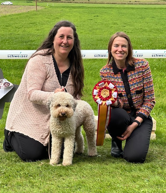 Wie jedes Jahr habe ich am Raduno vom Schweizer Lagottoclub mitgemacht. Das ist der Lagottoevent in der Schweiz mit Ausstellung und Arbeitsprüfung. Dieses Jahr feiert der Lagottoclub sein 30 jähriges Bestehen und aus diesem Anlass wurde für die Ausstellung mit Camilla Bäckman aus Schweden eine absolute Rassekennerin als Richterin eingeladen. Ich habe auf einen vorzüglichen Richterbericht für Fiori gehofft, aber sie hat alles übertroffen. Wiederum war Fiori sehr motiviert und somit gewannen sie nicht nur die Championsklasse, sondern wurde auch BOB, Beste der ganzen Ausstellung und schönster Hund aus Schweizer Zucht! Ich hätte nie damit gerechnet, freue mich aber riesig und bin sehr dankbar und glücklich – ein Traum ging für mich in Erfüllung. Danke Camilla für diese Anerkennung und Danke Chrigi, Lieta und Momo für meine Fiori. Ebenfalls durfte ich noch Pepita, ebenfalls eine Momo-Tochter von Yvette in der offenen Klasse zeigen und auch sie hat diese Klasse gewonnen – was für ein Tag.